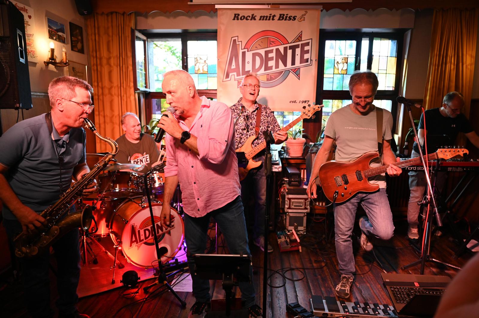 Alles lesenWir sind Aldente, eine sechsköpfige Rockband aus Eitorf, und machen seit über 40 Jahren gemeinsam Musik. In dieser Zeit haben wir unseren ganz eigenen Stil entwickelt – irgendwo zwischen Rock, Jazz, Blues und Groove. Was uns auszeichnet? Wir spielen sowohl eigene Songs als auch Coverstücke, denen wir immer unsere ganz persönliche Note verpassen.